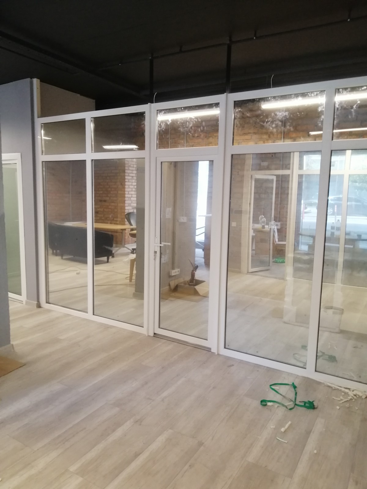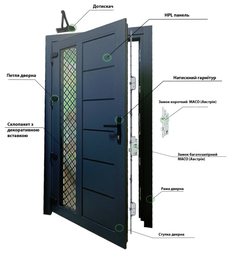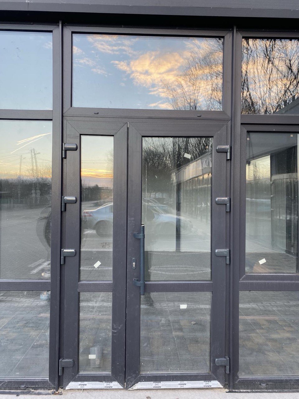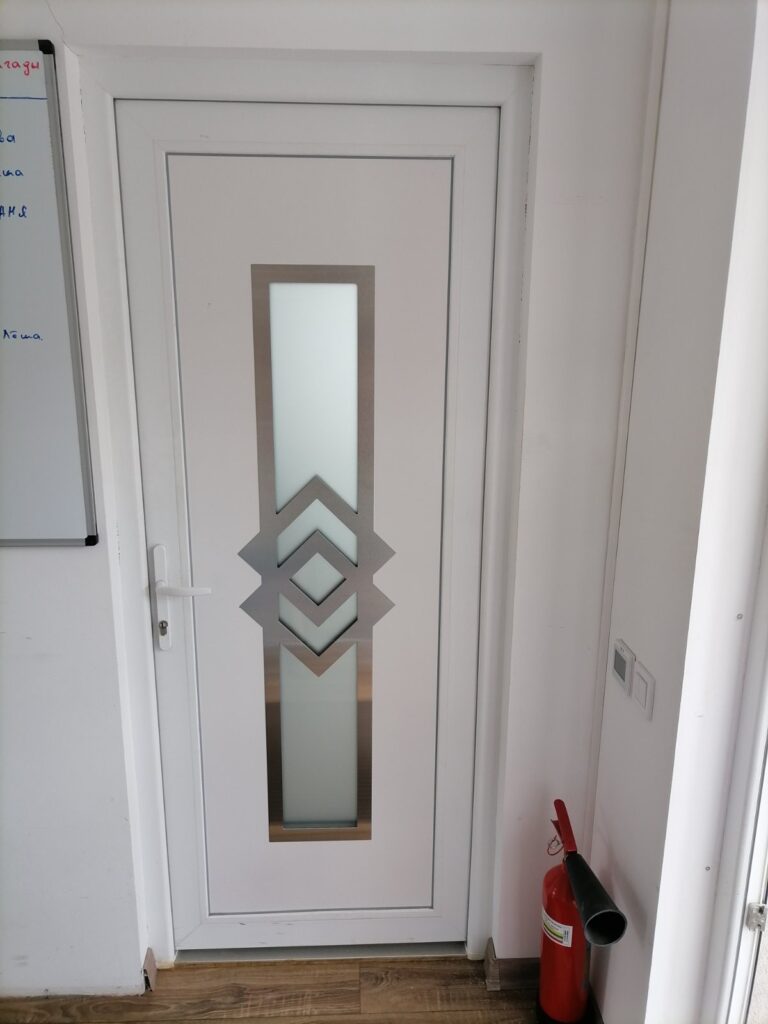 Входные металлопластиковые двери могут быть “глухими”, в данном случае используется сендвич-панель или HPL панель, или прозрачными со стеклопакетами.